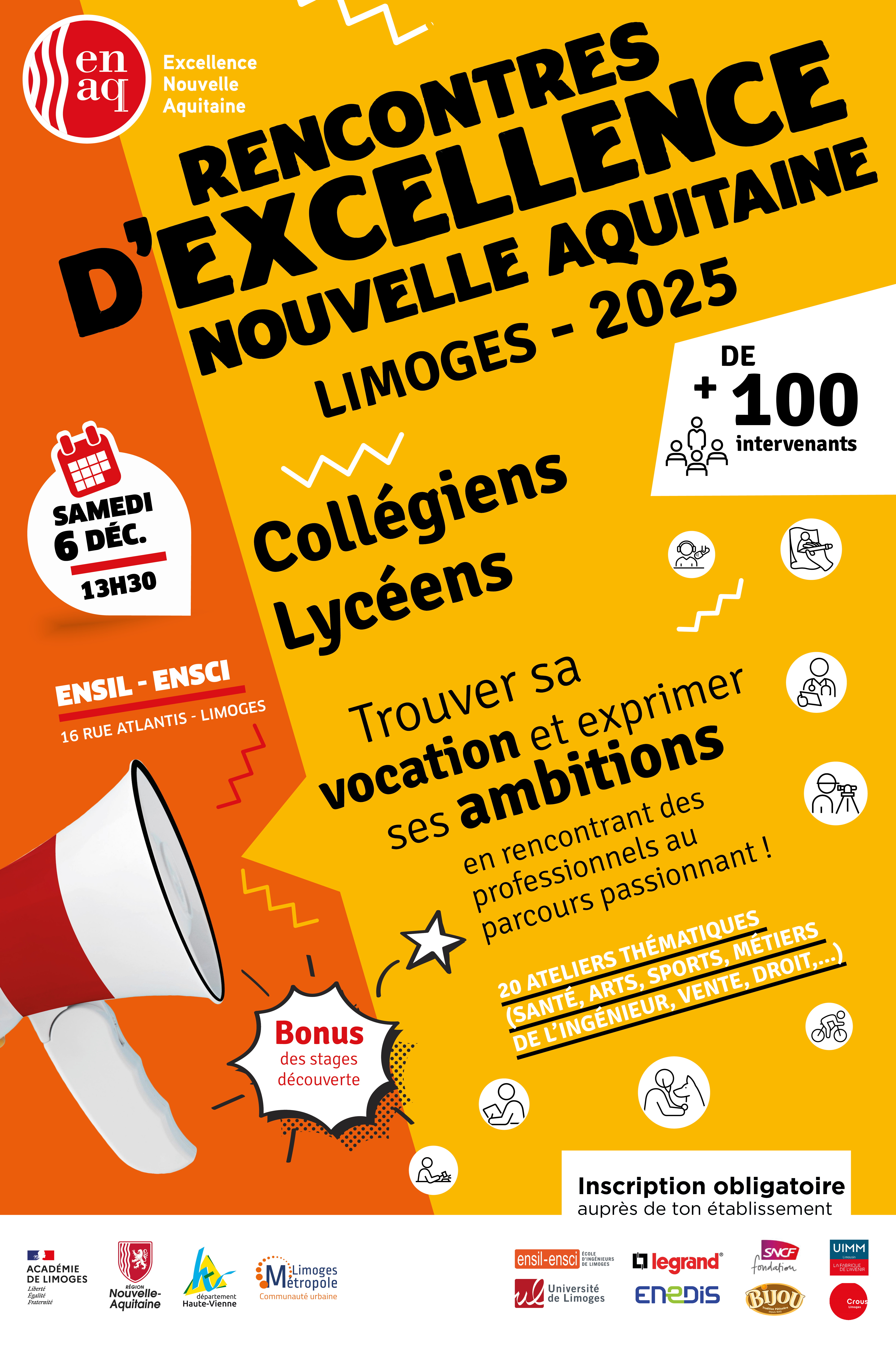 Le samedi 6 décembre 2025, de 13h30 à 17h30, se tiendront les Rencontres de l'Excellence à l'ENSIL de Limoges.